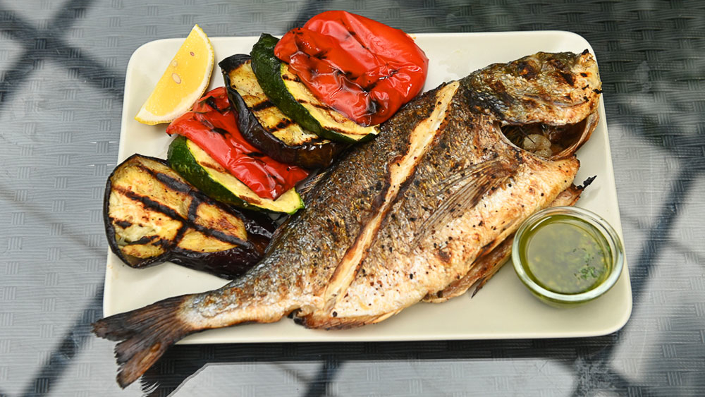 Дорадо на гриле с овощами. Овощной салат микс