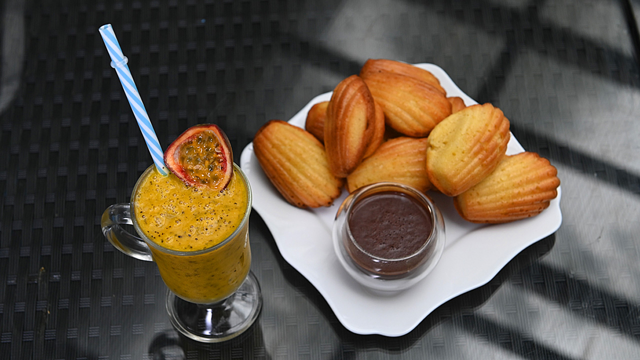 Мадлены с шоколадным соусом. Манговый смузи