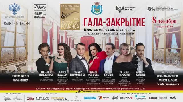Гала-закрытие фестиваля приурочено к 185-летию со дня рождения П.И. Чайковского. В программе концерта – жемчужины вокальной лирики Чайковского, а также оперные номера, проникнутые романсовыми интонациями. Гала-закрытие станет красивой финальной точкой фестиваля «Мир классического фестиваля» и подарит слушателям незабываемые воспоминания. ИСПОЛНИТЕЛИ: Заслуженная артистка России Оксана Федорова (меццо-сопрано) Заслуженный артист Республики Татарстан Альберт Жалилов (баритон) Полина Шамаева (меццо-сопрано) – ведущая солистка Московского театра «Новая опера» им. Е.В. Колобова Александр Полковников (баритон) – солист Большого театра России Ярамир Низамутдинов (тенор) – солист Мариинского театра Наталия Нарожная (сопрано) – ведущая солистка Донецкого государственного академического театр оперы и балета Заслуженный артист Республики Северная Осетия – Алания Виктор Коротич (баритон) Партия фортепиано – лауреаты международных конкурсов Мария Чернова и Георгий Мигунов Ведущие: Гюльнара Масляева, Александр Шаров ПРОГРАММА «То было раннею весной» (сл. А. Толстого) «День ли царит» (сл. А. Апухтина) Исполняет Оксана Федорова Партия фортепиано – Георгий Мигунов «Нет, только тот, кто знал» (сл. Л. Мея) «Средь шумного бала» (сл. А. Толстого) Исполняет Александр Полковников Партия фортепиано – Георгий Мигунов «Скажи, о чем в тени ветвей» (сл. В. Соллогуба) «Забыть так скоро» (сл. А. Апухтина) Исполняет Наталия Нарожная Партия фортепиано – Мария Чернова «Слеза дрожит» (сл. А. Толстого) «Снова, как прежде один» (сл. Д. Ратгауза) Исполняет Альберт Жалилов Партия фортепиано – Мария Чернова «Отчего?..» (сл. Л. Мея) Исполняет Мария Галкина Партия фортепиано – Георгий Мигунов «В эту лунную ночь» (сл. Д. Ратгауза) «Хотел бы в единое слово» (сл. Л. Мея) Исполняет Ярамир Низамутдинов Партия фортепиано –Мария Чернова «Кабы знала я» (сл. А. Толстого) «Песнь цыганки» (сл. Я. Полонского) Исполняет Полина Шамаева Партия фортепиано – Георгий Мигунов «Благословляю вас, леса» (сл. А. Толстого) «Серенада Дон Жуана» (сл. А. Толстого) Исполняет Виктор Коротич Партия фортепиано – Мария Чернова Дуэт Ольги и Татьяны из оперы «Евгений Онегин» Исполняют Полина Шамаева, Наталия Нарожная Партия фортепиано – Георгий Мигунов Ариозо Ленского из оперы «Евгений Онегин» Исполняет Ярамир Низамутдинов Партия фортепиано – Мария Чернова Ариозо Онегина из оперы «Евгений Онегин» Исполняет Виктор Коротич Партия фортепиано – Мария Чернова Дуэт Лизы и Полины из оперы «Пиковая дама» Исполняют Мария Галкина, Полина Шамаева Партия фортепиано – Георгий Мигунов Дуэт Беса и Солохи из оперы «Черевички» Исполняю Александр Полковников и Оксана Федорова Партия фортепиано – Георгий Мигунов
