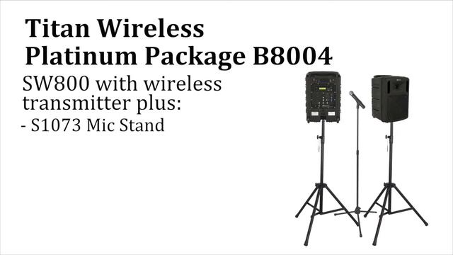 http://www.ampli.com/portable-pa-system/800-Titan-Wireless-Portable-PA.aspx The AmpliVox Titan Wireless Portable PA is a system you can take anywhere, indoors or out, to reach up to 2500 people with crystal clear voice or music. Its powerful 100 watt amp projects sound to a room as large as 10,000 sq. ft. yet it weighs only 40 lbs. and can be rolled anywhere using built-in luggage handle and wheels. Now, with Titan Wireless Package B8004, you can expand the capabilities of this versatile PA system. The Titan Wireless Platinum Package B8004 starts with: - the SW800 - adds a mic stand - two heavy duty tripods for greater sound dispersion - SC800 Companion Speaker - and an additional wireless microphone Adding a second speaker lets your reach an even larger audience with clearer intelligible sound to every set of ears. The second speaker has a built-in 100 watt amplifier and panel mount wireless receiver to receive sound from a choice of different wireless microphones included with the SW800 base unit. The B8004 adds a second wireless mic for an additional presenter. Get Titan Wireless Package B8004 to make sure you have the sound coverage and versatility you need. Extend your voice with AmpliVox.