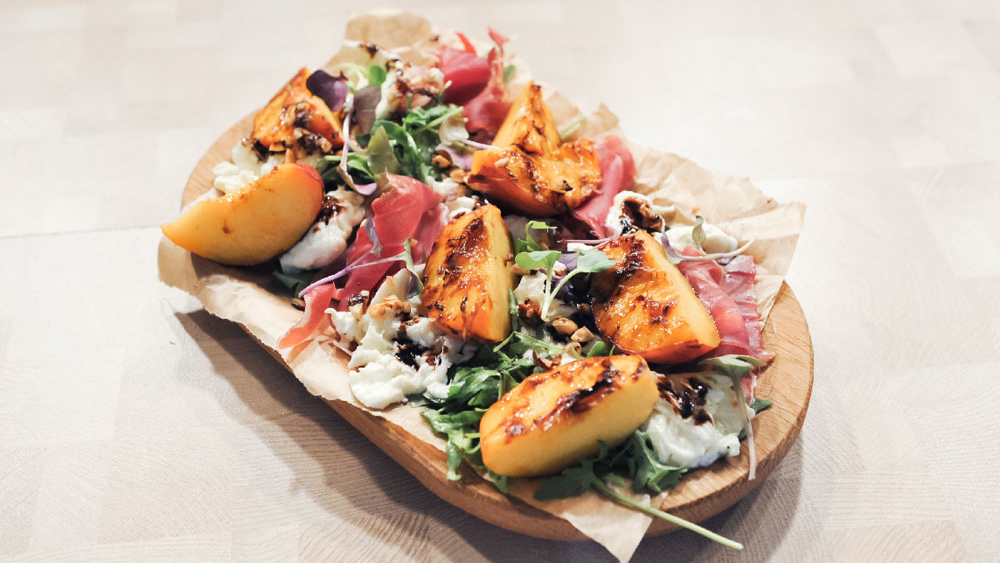 Цыплята в кефире и зелени. Шашлычки из баранины. Салат из персиков, моцареллы и прошутто