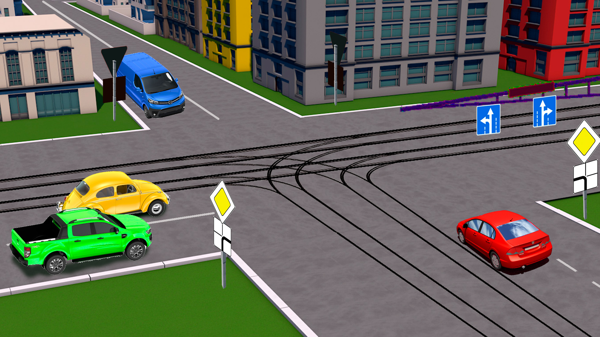 На выбор разрешенных траекторий для движения, в данной ситуации, влияют: знаки, полосы для движения и трамвайные пути. Давайте определим разрешенные траектории всех водителей и определим у кого из них меньше всего разрешенных траекторий для движения. Решите эту задачу и поделитесь ею с друзьями. Возможно, им тоже будет интересно?