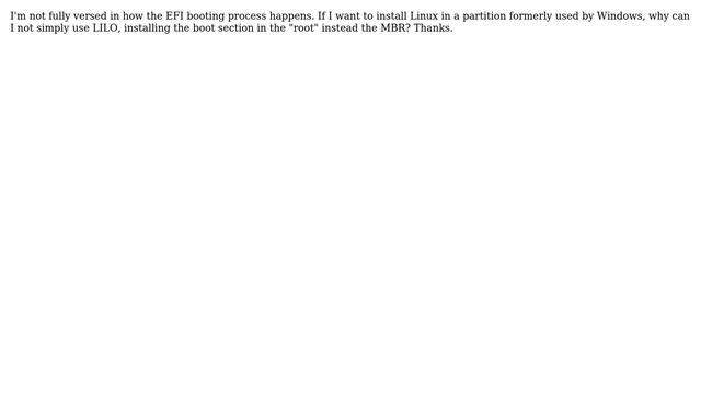 Apple: If MacbookPro has BIOS emulation, why the need for ELILO for Linux? Helpful? Please support me on Patreon: https://www.patreon.com/roelvandepaar With thanks & praise to God, and with thanks to the many people who have made this project possible! | Content (except music & images) licensed under CC BY-SA https://meta.stackexchange.com/help/licensing | Music: https://www.bensound.com/licensing | Images: https://stocksnap.io/license & others | With thanks to user pmdj (apple.stackexchange.com/users/24746), user Asker (apple.stackexchange.com/users/23917), and the Stack Exchange Network (apple.stackexchange.com/questions/66150). Trademarks are property of their respective owners. Disclaimer: All information is provided "AS IS" without warranty of any kind. You are responsible for your own actions. Please contact me if anything is amiss at Roel D.OT VandePaar A.T gmail.com