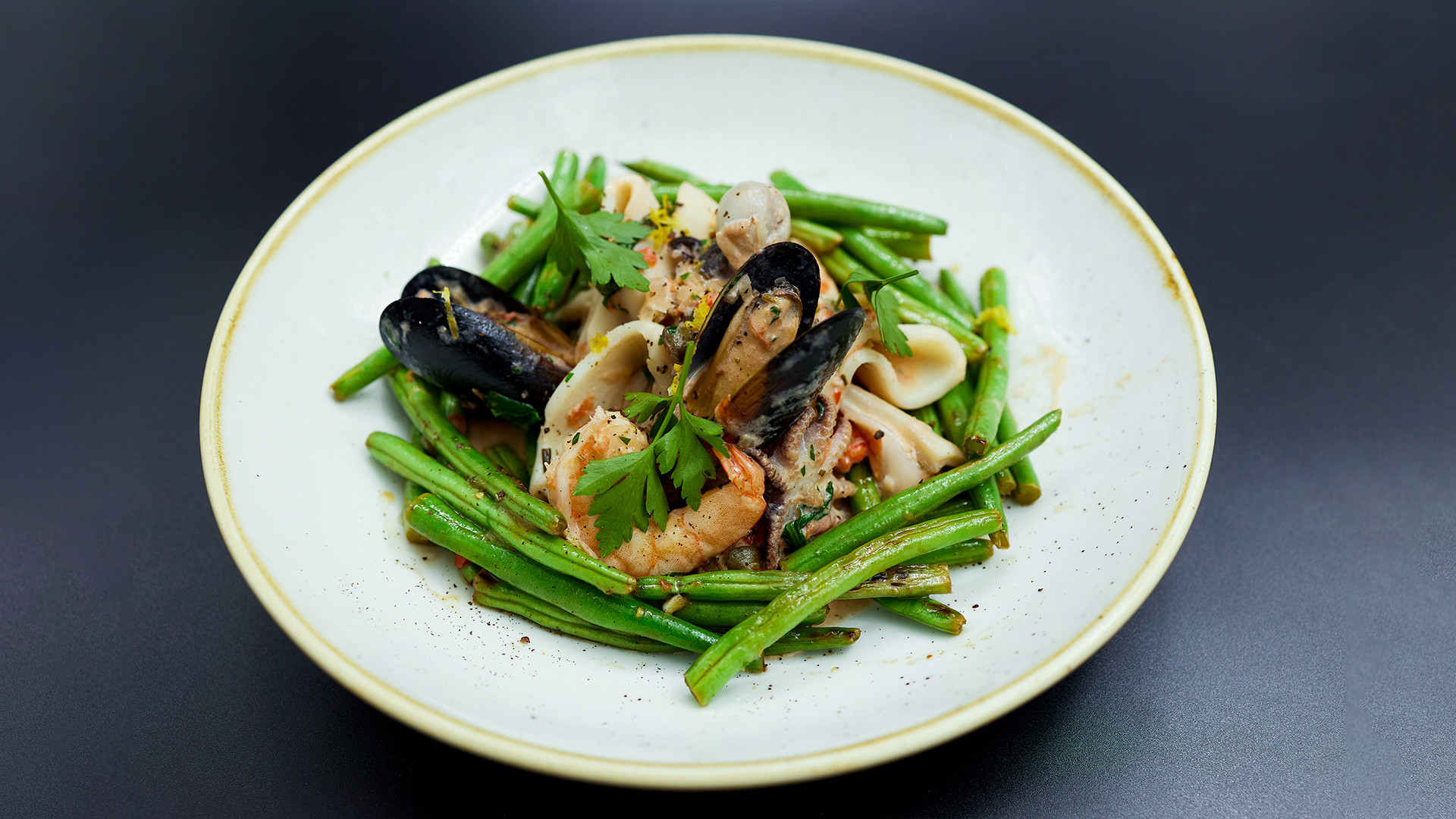 Соте из морепродуктов с гарниром из зеленой фасоли