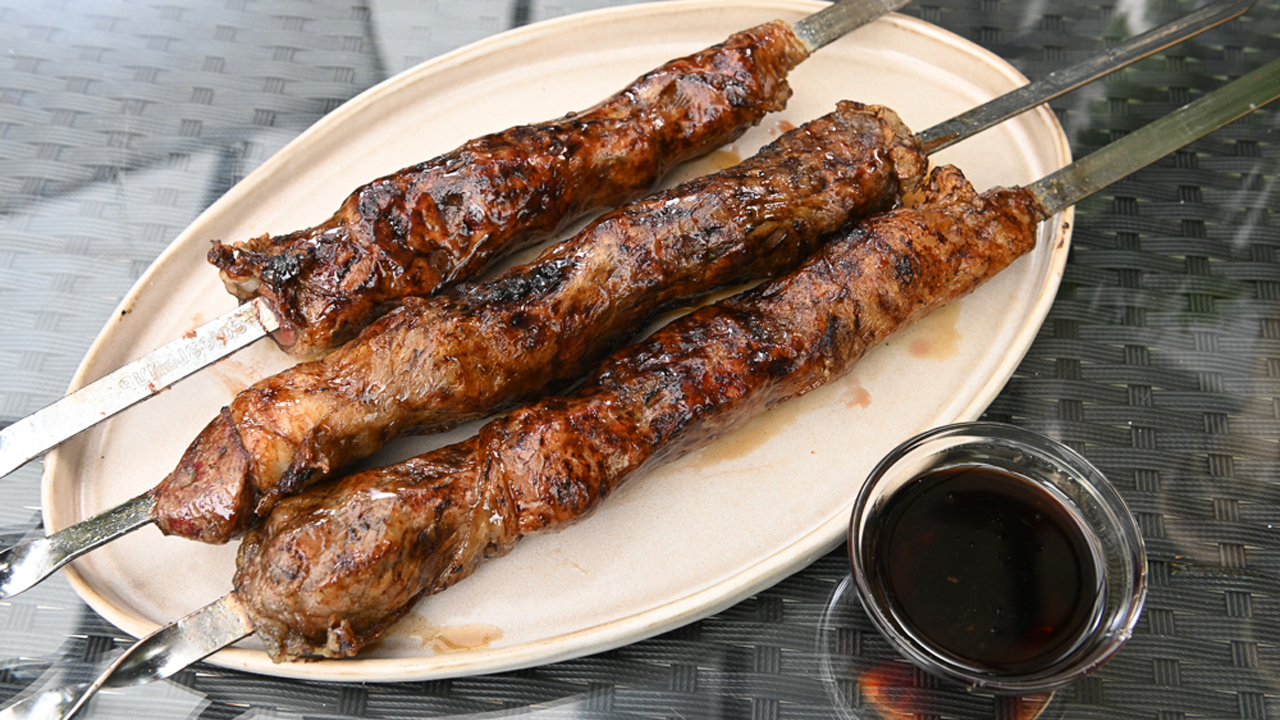 Шашлык из говяжьей печени в сальной сетке. Соус Наршараб