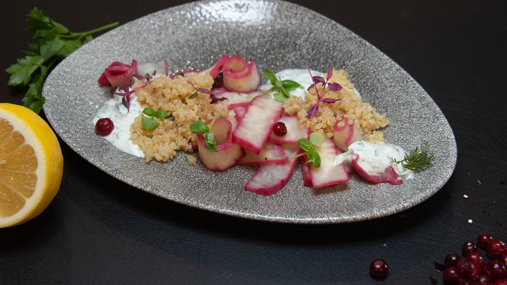 Салат из корневого сельдерея с киноа. Йогуртовый десерт с семенами чиа. Компот из клубники и мяты