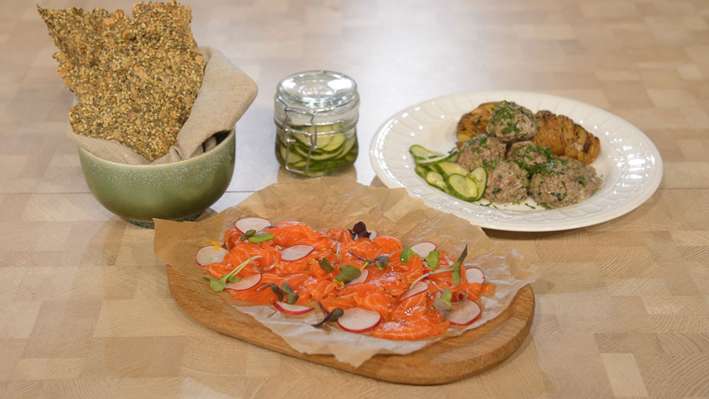 Гравлакс с крекерами. Тефтельки со шпинатом. Запеченная картошка. Маринованные огуречные ломтики