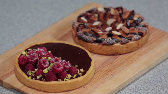 Тарт со сливой и миндальным кремом. Тарт с шоколадным ганашем и малиной