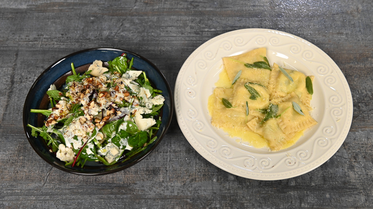 Равиоли с рикоттой и шпинатом. Салат из груши, горгонзолы и грецкого ореха