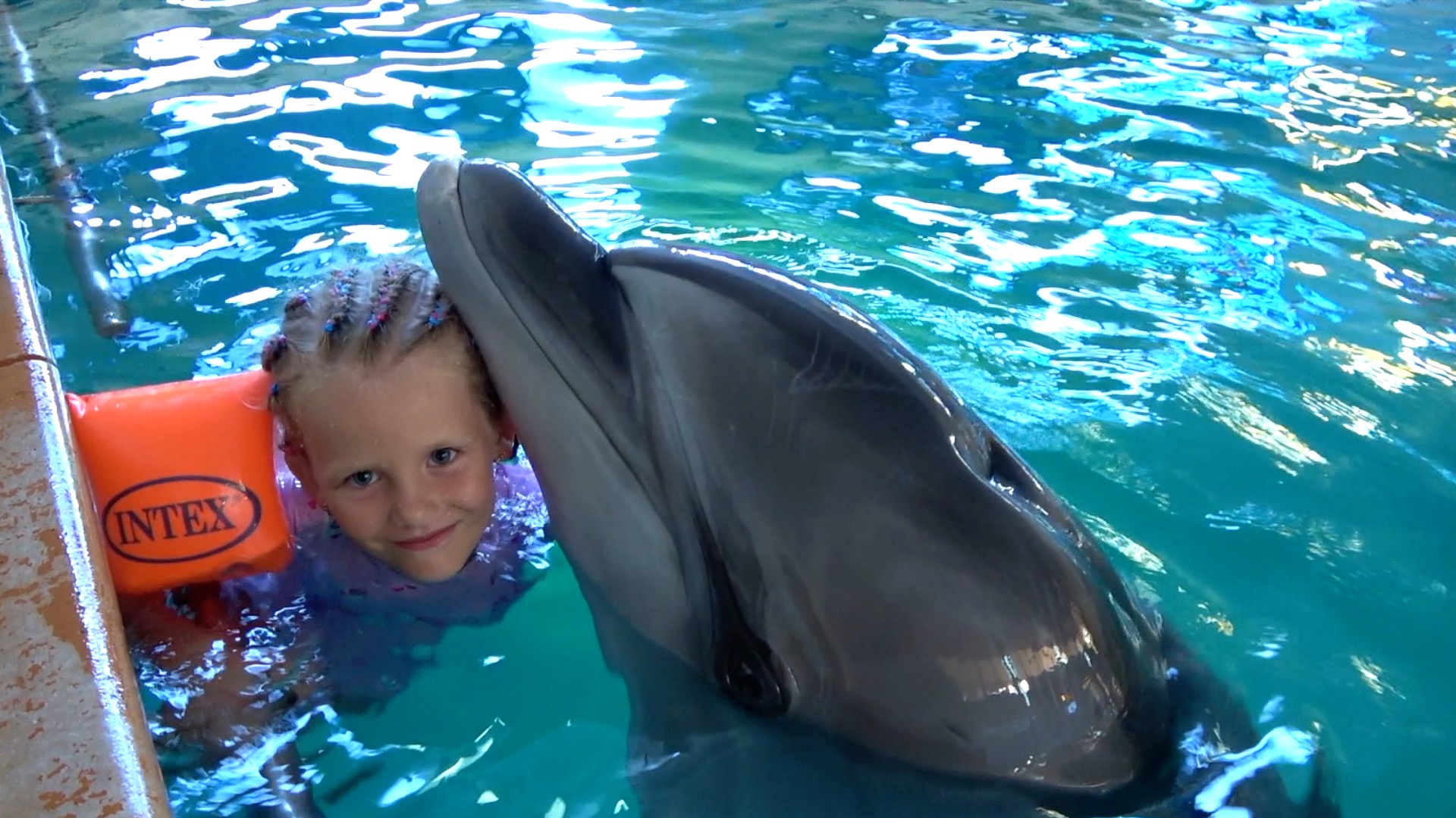 Милана в бассейне плавает с дельфином. Milana Like Влог