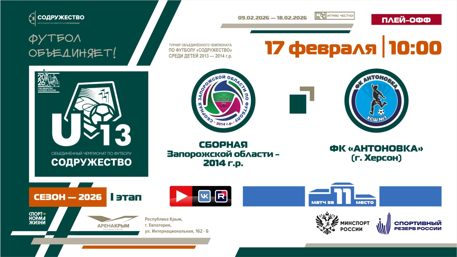 Игра за 11-ое место | Сборная Запорожской области 2014 г.р - ФК «Антоновка» (г. Херсон) | 17.02.2026 | 10:00