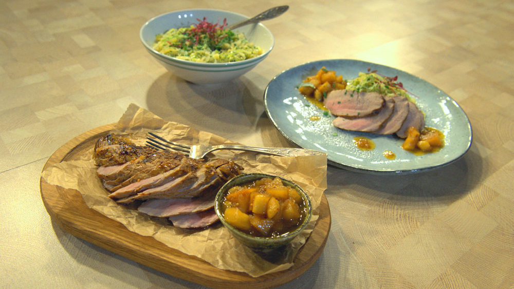 Суп из тыквы и яблок. Филе-миньон с капустой и яблочным чатни. Шоколадный мусс со взбитыми сливками