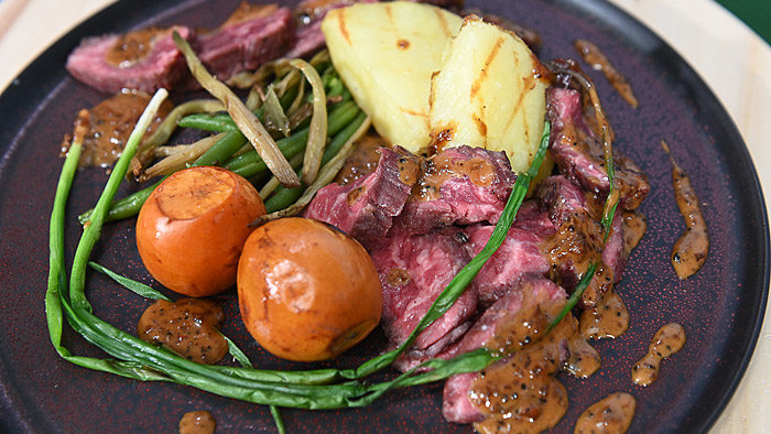 Мраморная говядина с мушмулой, печеным картофелем и черно-перечным соусом. Паста с анчоусами
