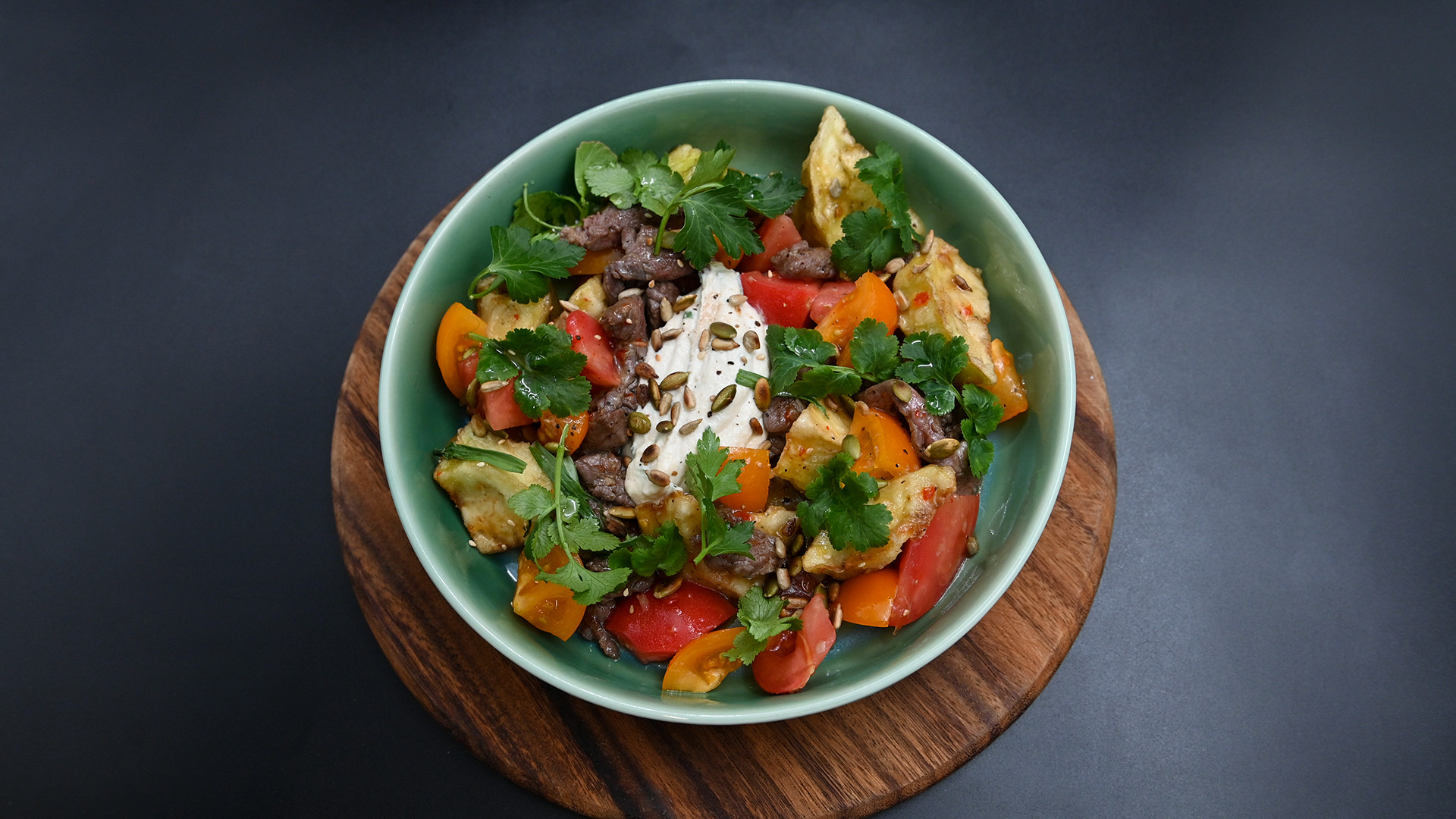 Салат с теплой говядиной, баклажаном и кремом кешью