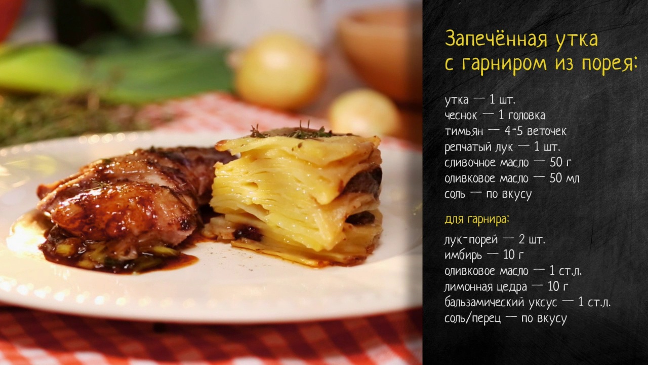 Рецепт запечённой утки с гарниром из порея