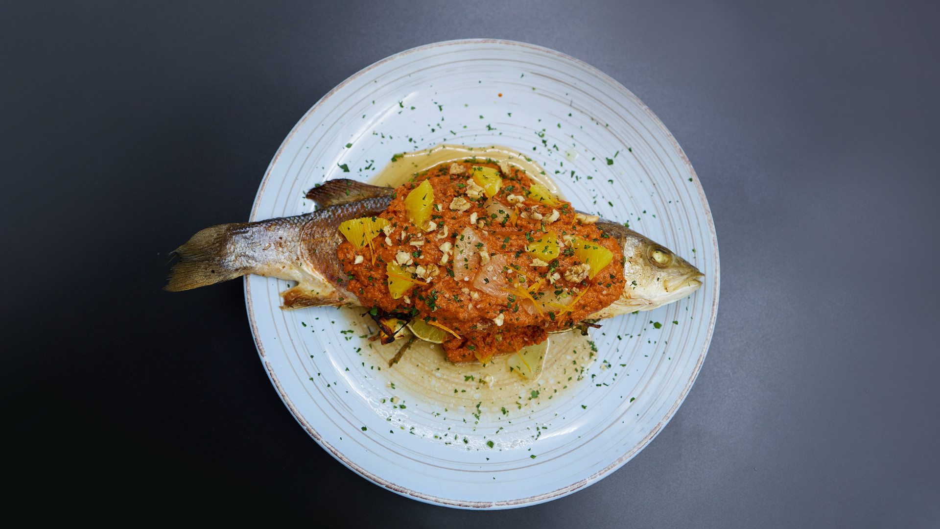 Сибас, запеченный с травами в фольге с соусом мухаммара