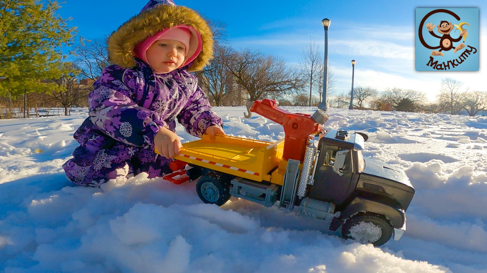 Мы вышли на прогулку взяв с собой машинки игрушки - Экскаватор, Погрузчик и Красную машинку. Машинки игрушки будут кататься по снегу, строить снежные дороги и гараж.