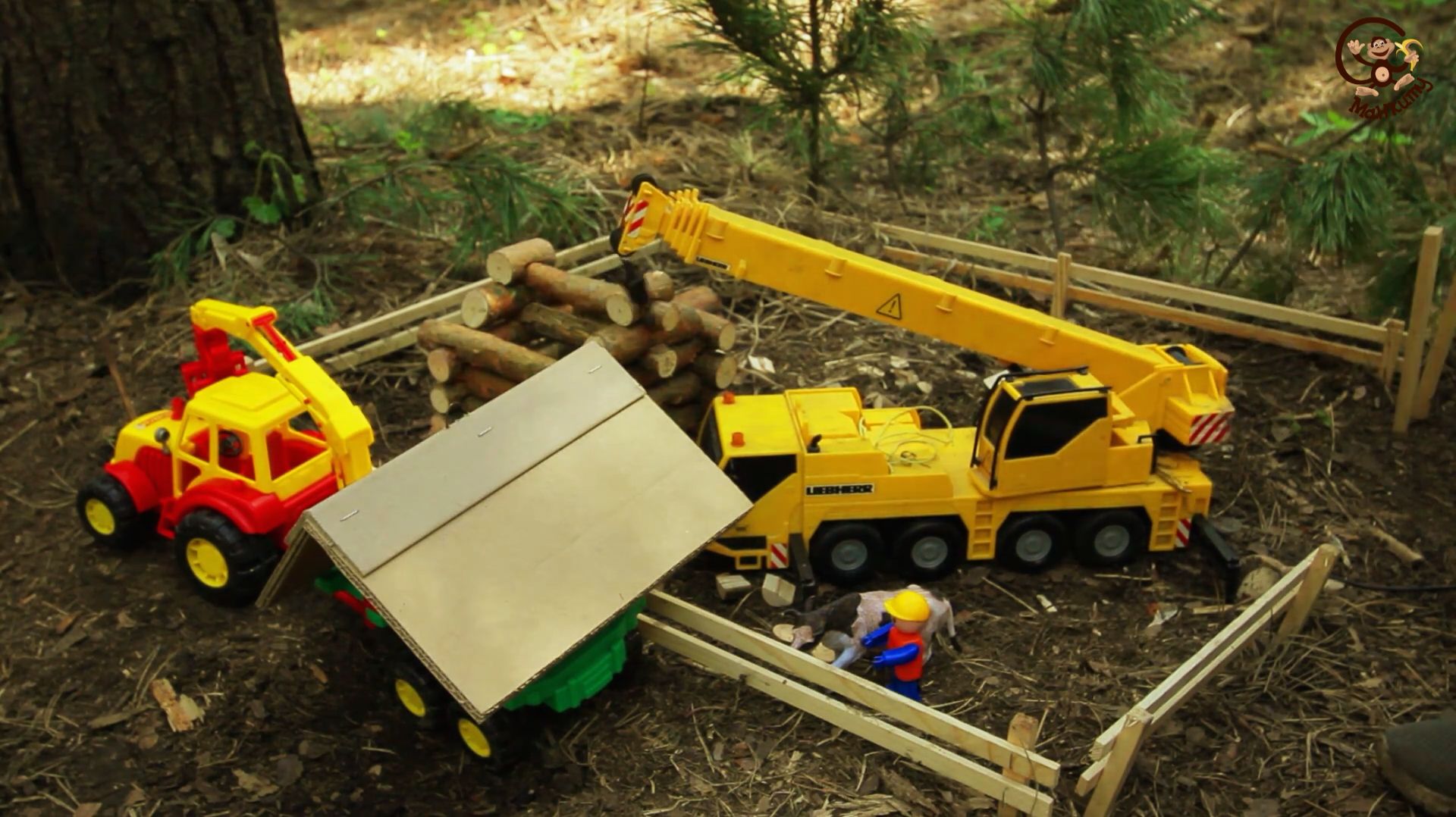 Мультик про машинки. Трактор с прицепом, экскаватор и автокран строят дом. МанкиМульт