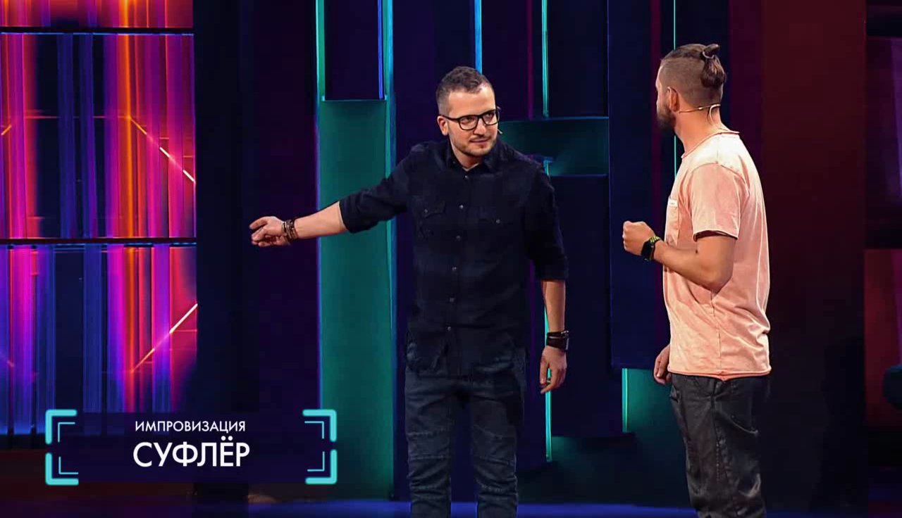 Дмитрий Позов и Сергей Матвиенко разыгрывают импровизацию «Суфлёр» про дирижера и скрипача. Вбрасывать слова для импровизации им будет актер Станислав Ярушин.