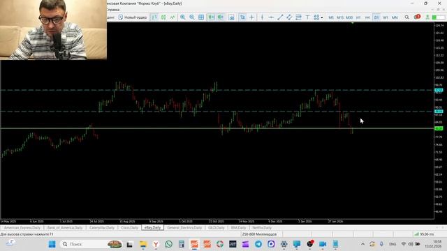 Трейдинг и инвестиции Обзор рынка акций 13-02-2026 AXP BAC CAT CSCO EBAY GE GILD IMB NFLX