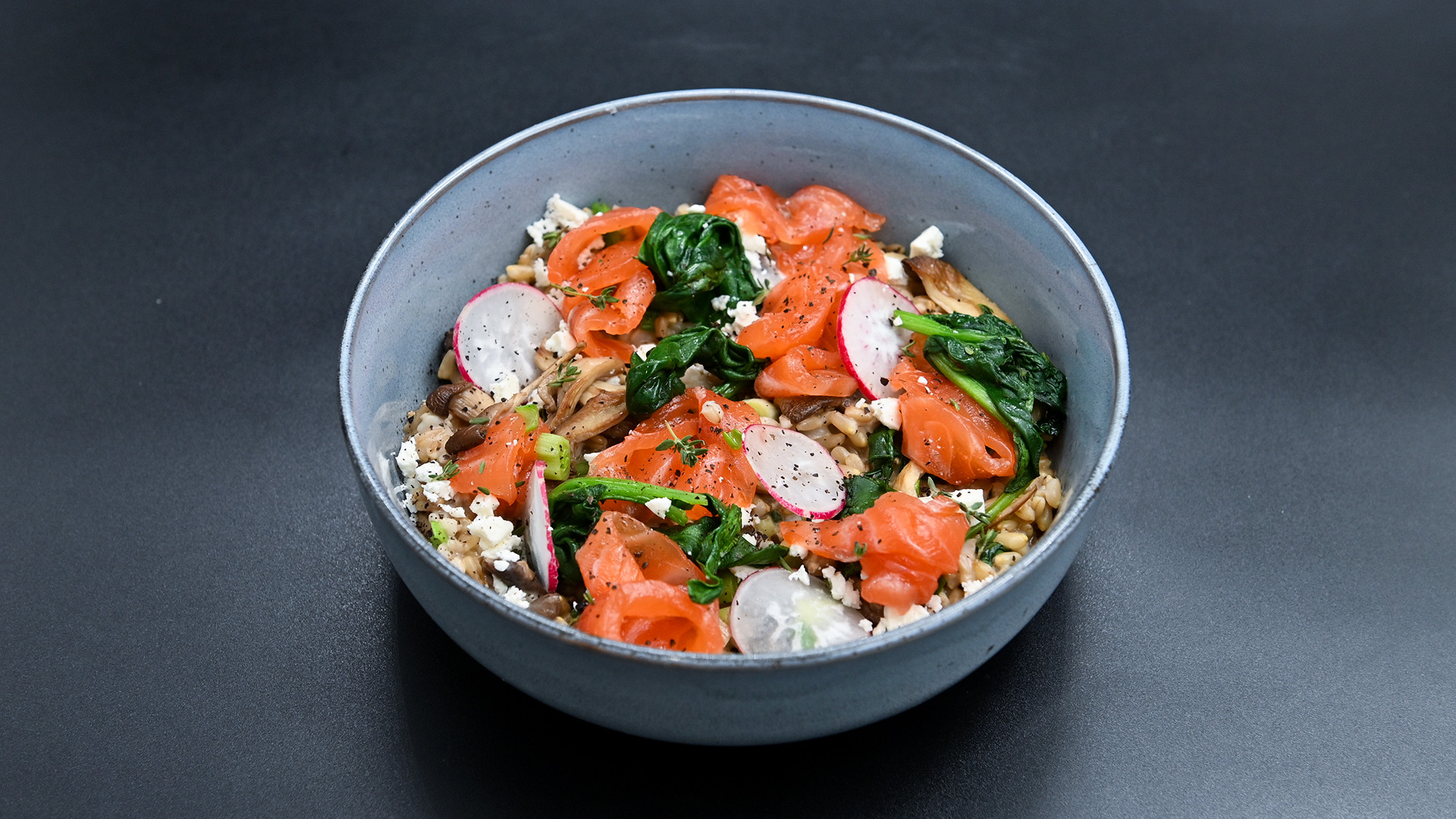 Овсяная каша со шпинатом, лососем и грибами.